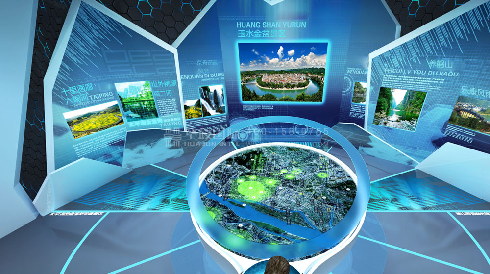 該展廳設(shè)計以“中國天眼”為設(shè)計靈感,用天眼(天坑)的科幻模擬造型,結(jié)合樓體外觀,整體打造“開眼看世界”的印象格局。利用磁懸浮技術(shù),設(shè)置多個球幕,在空中懸浮上升、下降,讓游客體驗(yàn)天體運(yùn)動場景,各球幕呈現(xiàn)當(dāng)?shù)卮硇跃坝^。并通過虛擬導(dǎo)游的方式,游客可具體了解本地各個景區(qū)的信息,合理規(guī)劃旅游行程安排。還以交通規(guī)劃切入,按動觸控屏,即可點(diǎn)亮河流帶,實(shí)現(xiàn)實(shí)時交通交互;可查詢到周邊的交通規(guī)劃,吃、住、行、游、購、娛旅游產(chǎn)業(yè)鏈等。